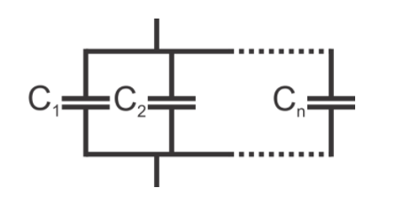 其中 C eq是電容器并聯(lián)連接的等效電容,V 是通過輸入線施加到電容器的電壓,Q 1到 Q n表示存儲在每個相應(yīng)電容器中的電荷。這給我們帶來了一個重要的結(jié)論: